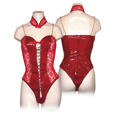 チャイナ服とボンテージ衣装の融合!エナメル風のレッドカラーが新鮮!レースの刺繍と、チョーカーで、チャイナ風に。