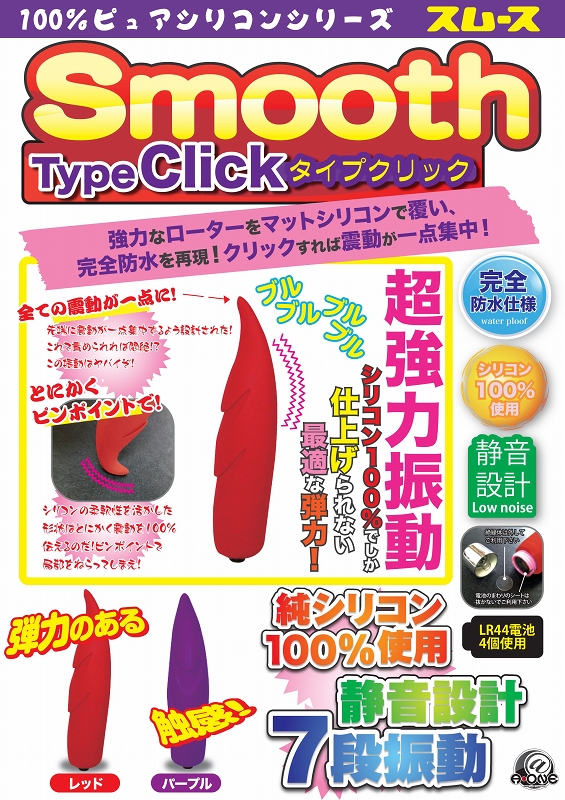 強力ローターをマットな質感のシリコンで覆った柔らかローター「スムース」に新タイプの「クリック」が仲間入り!振動を一点に集める独特の先端フォルムで、局部をピンポイントにブルブルと刺激!7段階の振動切り替え機能を搭載した、静音設計の新感覚ローターです。