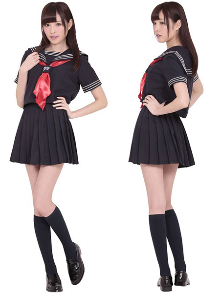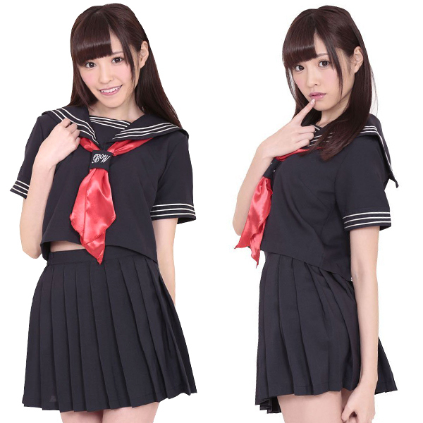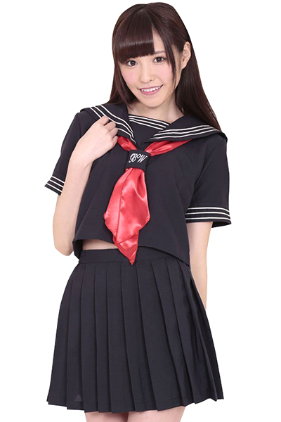 制服コスプレの定番!紺地に3本ラインの入った半袖セーラー服です。 このセーラー服は、スカーフ留めに文字が入ったお嬢様学校仕様!赤と白のスカーフ付きですので、どちらかお好きな色で女子高生コスプレを楽しめます。 |