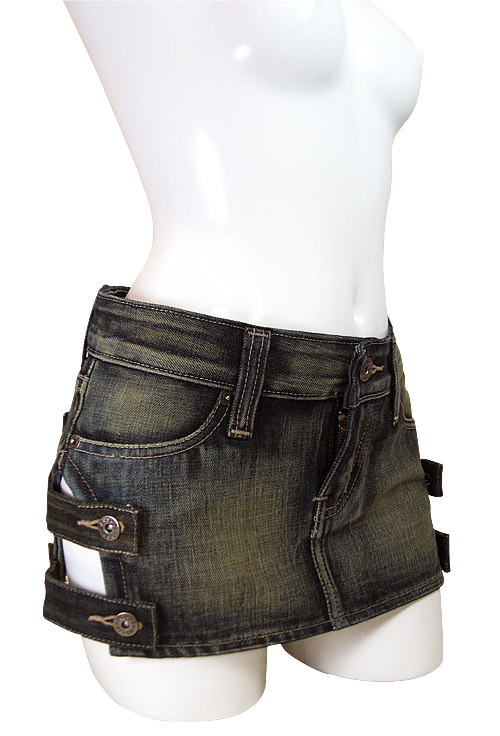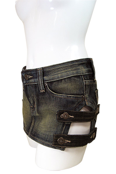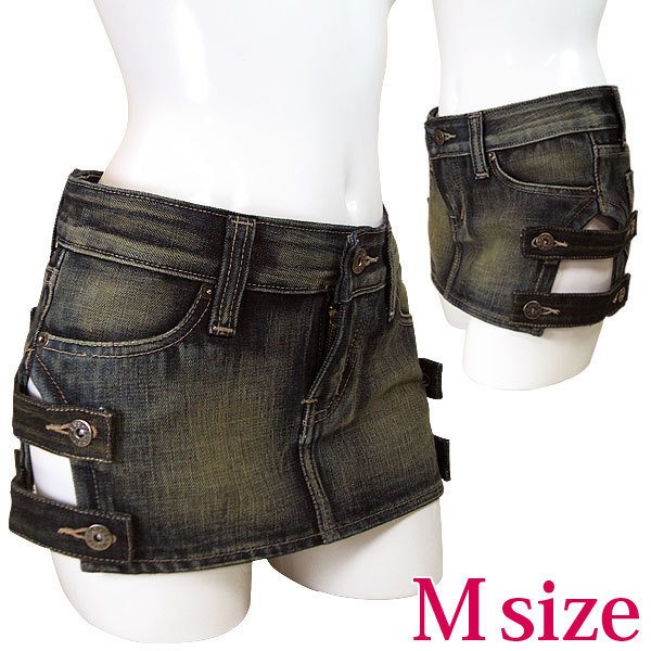 両サイドの太股部分をカット!チラ見えセクシーなデニムのミニスカート(M)。 人気のデニム生地を使用した、ヒップハンガーのセクシーコスチューム!両サイドを大胆にカットして、ボタン留めのベルトデザインに仕立てました。 裾の一段だけベルトを外したり、片側だけ外してもう片方をクロスさせてみたり、アレンジするのも面白そう! ※XLサイズ(b18368)あります |