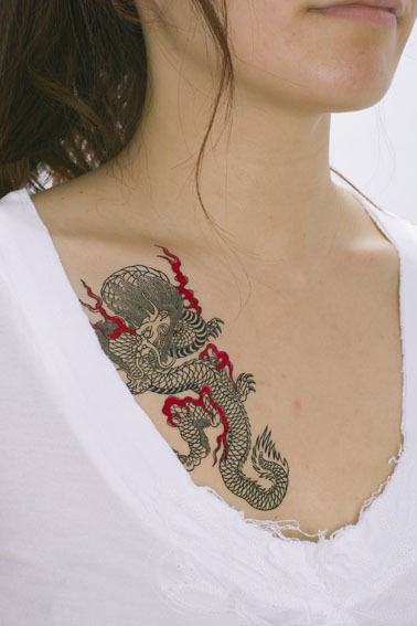 イベントやお祭りに大活躍!レギュラーサイズの刺青シール「線画・黒ドラゴン」。 コスチューム等に合わせて露出した肌に貼り付けるだけ!特殊な素材を使用しているので皮膚の動きと一緒に伸び縮みし、入浴したり海やプールに入っても2〜3日は取れません。 祭り化粧を取る際は、専用のクリーナーやクレンジングクリーム、ベビーローション等で拭き取って下さい。 |