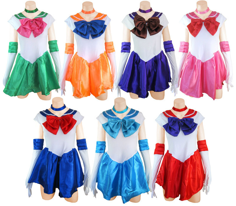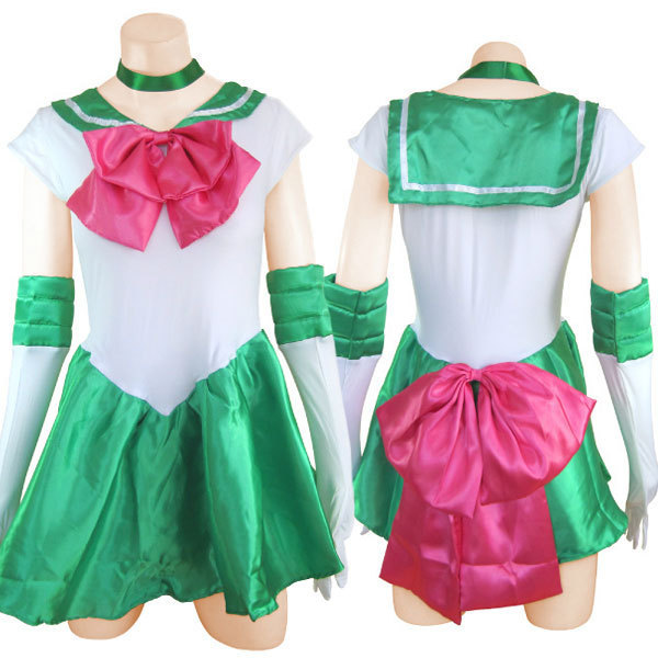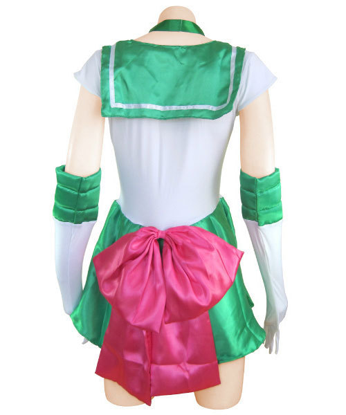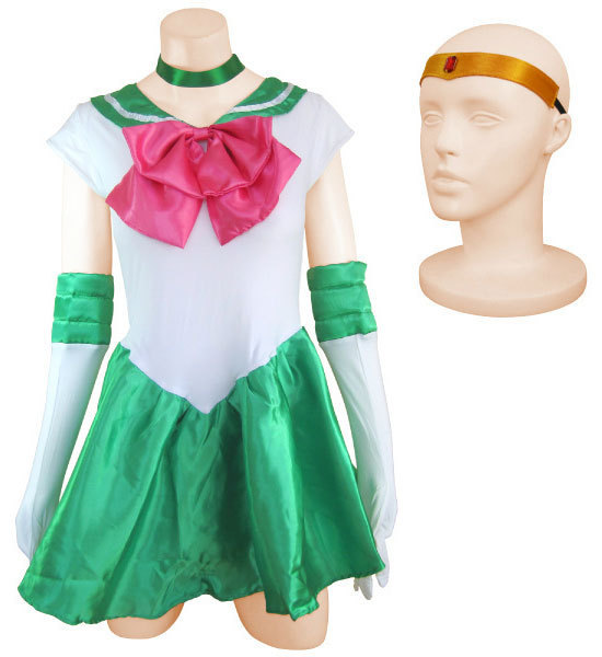 ティアラやグローブの小物も充実!スカート一体型ワンピースのセーラー戦士コスチューム(グリーン)。 可愛らしい胸元の大きめピンクリボンは取り外し可能!7色揃えてなりきりたいアニメキャラのコスプレ衣装です。 |