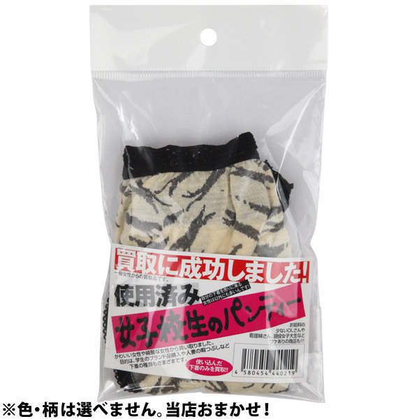 女子校生の履いていた下着をゲット!使用済みのエッチな生パンティー(1枚入り)。 匂いフェチの妄想族にはたまらない夢のお宝アイテム!直接匂いを嗅いだり、エアドールに履かせてみたり、自分で履いてみたり…と使い方は貴方のお好みで!その生々しい使用感に興奮が止まらないフェティッシュな匂いグッズです。 ※中身の色柄、形状等はその都度異なります ※USED加工を施した新品未使用品です |