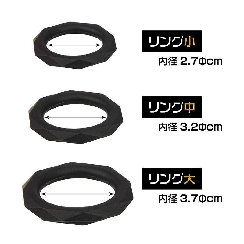 スタイリッシュなカッティング加工を施した、ブラックシリコンの男性用コックリング3個セット。 ●さらりとしたシリコン100%素材を使用●リング周囲を宝石のファセットカットのように加工●気分で選べる小中大の3サイズセット●内径:小2.7φcm・中3.1φcm・大3.6φcm。 竿を程よく締めつけることで早漏防止にも!さらに、カット加工がパートナーへ刺激を与えます。 その日の気分でサイズを使い分けたり、それぞれを玉・根元・カリ首に同時装着してもOKな万能サポートグッズです。 |