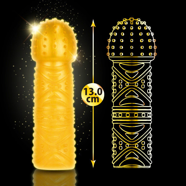 いつもより逞しくセクシーに!金色に輝くゴージャスなフルカバータイプのペニスサック。 ●キラキラ眩しいゴールドカラー●びよ〜んと伸びるストレッチ素材を採用●安心安全なエラストマー製●ペニス全体を覆うオールカバータイプ●無数のツブツブ突起●変則的なリズムの快感を与える刺激的な模様●ロングプレイをサポート。 挿入直後から絶頂を迎えるまで極上の快感を与え続ける…!一度使えばヤミツキ必至の男性補助グッズです。 |