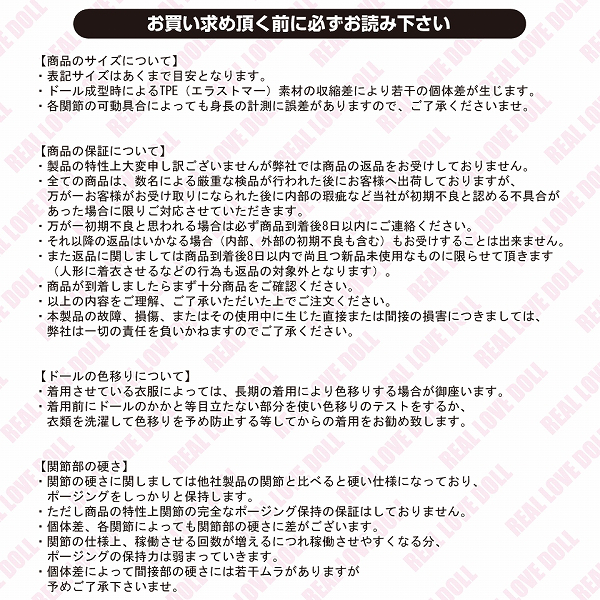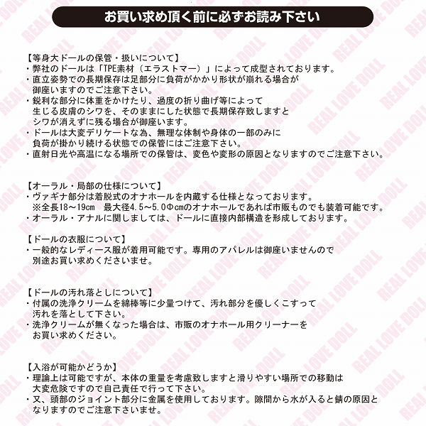 | ■仕様:パッケージ:30.0×157.0×43.0cm 身長:165cm 体重:約30kg スリーサイズ:B78cm・W53cm・H57cm |