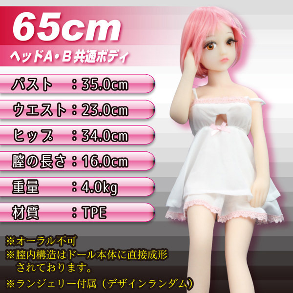 | ■仕様:パッケージ:66.5×27.5×17.5cm 本体:身長65cm・体重:約4.0kg スリーサイズ:B35cm・W23・H34cm 膣長16.0cm セット内容:本体、アイカラー、カツラ、専用衣装、USB式オナホウォーマー、コーム、ネイルグルー、手袋、洗浄用ポンプ |