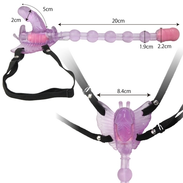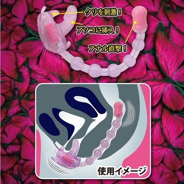 ガッシリ固定で3点同時責め!ベルト固定式のバタフライ型ローター「バタフライエフェクト」。 ●挿入したままベルトで固定可能●裏側の小突起でクリトリス責め●ペニス型の突起でヴァギナ責め●20cmのロングビーズでアナル責め●柔らかで丈夫なエラストマー素材●ヴァギナとアナル側に強力モーター●7種類の振動パターンを搭載。 前も後ろも強力悶絶刺激!奥深くまで響く快感振動のベルト装着型ローター。 バタフライのディルド部とアナルビーズ先端にダブルモーターを搭載!ゴム製ベルトでしっかりと固定できるので、装着したまま外出すれば屋外プレイもお楽しみ頂けます。 |