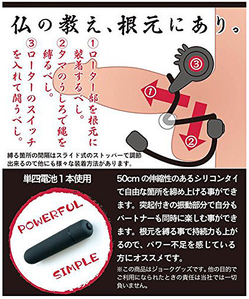 男の快感を助太刀!ロングなループタイデザインの電動ペニスリング「SUKEDACHINAWA(スケダチナワ)法」。 ●伸縮性のあるシリコンタイ●長さ約50cmのロングタイプ●スライド式で簡単に調整可●クリ用突起付きのローター●簡単操作のワンタッチ電源●ローターは着脱可能。 仏の教え、根元にあり!ロングなシリコンタイでお好きな箇所を自在に締め上げる男性用補助グッズ。 ローター部を根元に装着し、玉袋の後ろで縄を縛ってローターのスイッチをON!締め付けによる持久力UPだけでなく、クリトリスに刺激を与えるローター搭載でパートナーと快感を共有可能!快感もパワー不足もアシストしてくれるマルチなアイテムです。 |