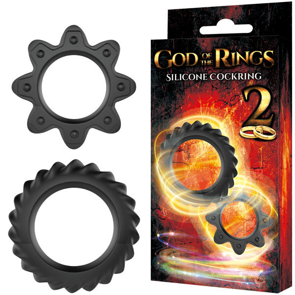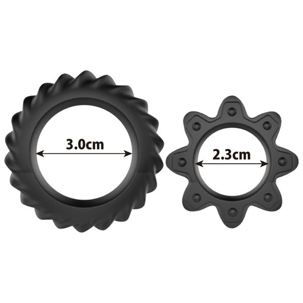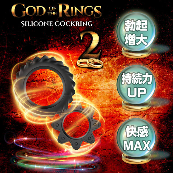 勃起増大、持久力UP、快感MAX!高品質シリコン製コックリング2種セット「ゴッドオブザリング 2」。 歯車のようなギア型フォルムの小リングは内径2.0cm、タイヤのようなねじ歯車型の大リングは内径3.4cm。 男性自身をしっかり締め付けて強力サポートするペニスリング2種セット!2個同時に装着すれば神の如きパワーがその竿に宿るかも。 |
