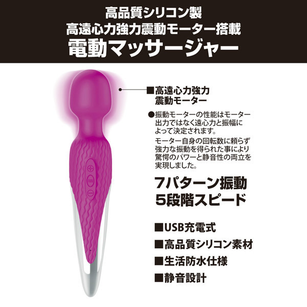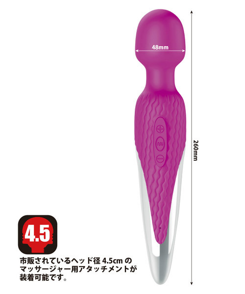 超強力振動でも静音性抜群!全長26cmのハンディサイズ電マ「プリティラブ パワフルワンドマッサージャー」。 高遠心力モーターで驚愕のパワーと静音性の両立を実現した電動マッサージャー。 7種類の超強力バイブレーションと5段階のスピード調整が可能、USB充電式(専用コード付属)&生活防水仕様でいつでも清潔に使えます。 『プリティラブ』シリーズのデンマキャップだけでなく、フェアリーミニ専用アタッチメントなど市販されているヘッド径45mmの電マアタッチメントも装着可能です。 |