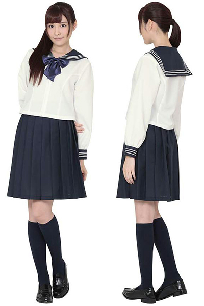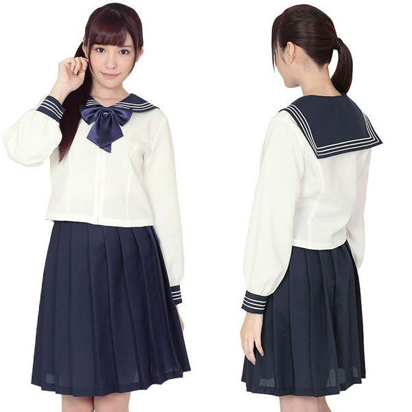 王道のセーラー服をアレンジ!前開きで襟や袖口の3本ラインが特徴的な長袖のセーラー服コスプレです。 ミドル丈のスカートにはプリーツがたくさん入っていて、正統派の学校制服となっていますが、着用もしやすくホワイトと紺のカラーにより清潔感と清楚さもあわせ持っています!イベント用としてはもちろん、学生気分に浸りたいときにもオススメです。 |
