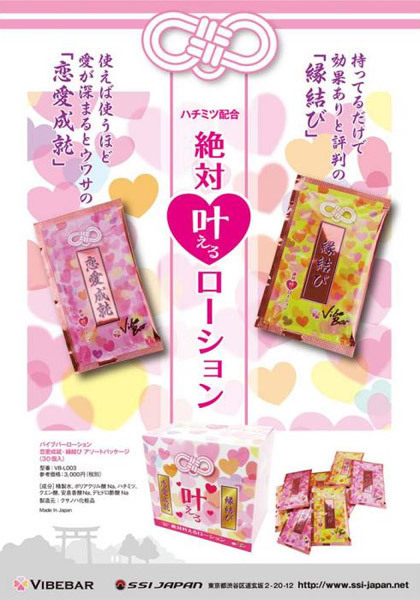見た目がまるでお守りのようなパッケージなので、恋愛成就のペアグッズとして持ち歩いてもよし!キラキラ光る愛らしいポケットローション「バイブバーローション 恋愛成就・縁結び アソートパッケージ」です。 カップルで使うことでより強い絆を育むことができ、持ち歩きやすいサイズだからポケットやバッグにそっと忍ばせることでいつでもどこでも使えます!国内の化粧品会社の製造で香料・着色料ともに不使用。 見た目が可愛らしいため女性の方から積極的に誘うときにも大活躍!ハチミツ入りなので女性に優しくお使いいただけます。 |