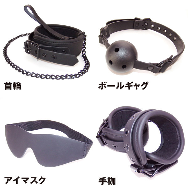 | ■仕様:パッケージ:26.0×35.9×6.0cm セット内容:首輪、ボールギャグ、アイマスク、足枷、パドル、ムチ、手枷 |