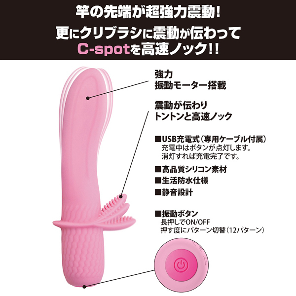 太さ最大3cmのぽっこりヘッドがGスポを直撃!内蔵されたモーターから伝わる強力振動で、細かな突起のついたブラシがクリトリスを高速で叩く♪ピンポイントで同時刺激することで「アッ」という間に絶頂快感へといざなうパステルピンクの可愛らしいUSB充電式バイブレーターです。 素材には手触り滑らかなシリコンを採用することで心地よい刺激を実現!12パターンもの豊富な振動が搭載されているから、個人の身体に合わせた振動でお楽しみいただけます。 USB充電式(専用ケーブル付き)、生活防水を搭載。 |