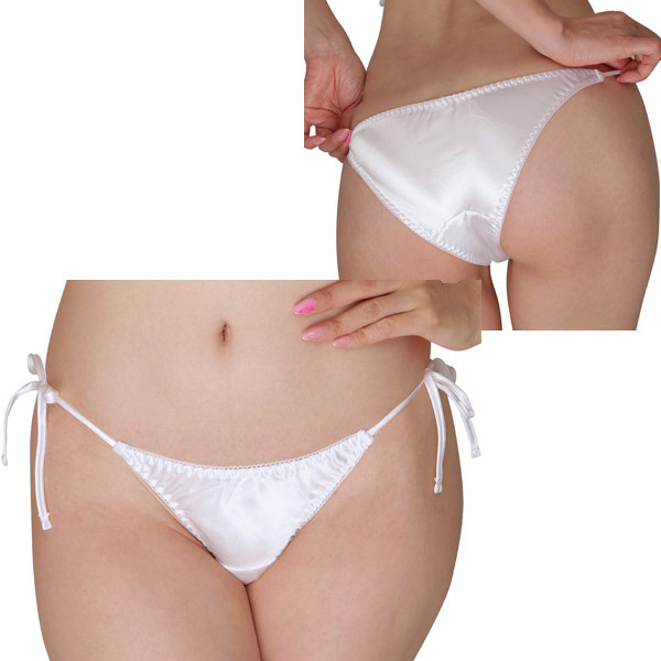 光沢感が美しいサテン生地の女性用フルバックショーツ。 両サイドはセクシーな結びヒモ仕様で、結び目をパートナーに解かせる楽しみも!ホワイトカラー |