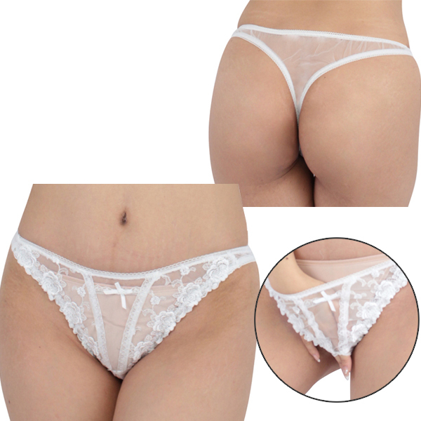 透け感のあるシースルー生地に、花の刺繍やスカラップレースなどあしらいエレガントに仕上げた可愛らしい日本製オープンランジェリー(ホワイト)。 お尻の丸みが際立つTバックで、クロッチ部分は着衣プレイに最適なオープン仕様となっています♪ |