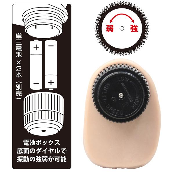 生々しいリアルな男根が貫く!仁王のごとくそそり立つ5.5cmの極太バイブ。 逞しく中折れしない硬質なボディ!強弱は回すだけのダイヤル式調整で初めてでも簡単に操作可能♪超激震を繰り出すハイパワー振動でGスポを責めに責めまくれ!電池式(単3電池を2本使用) |