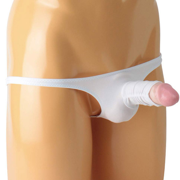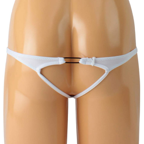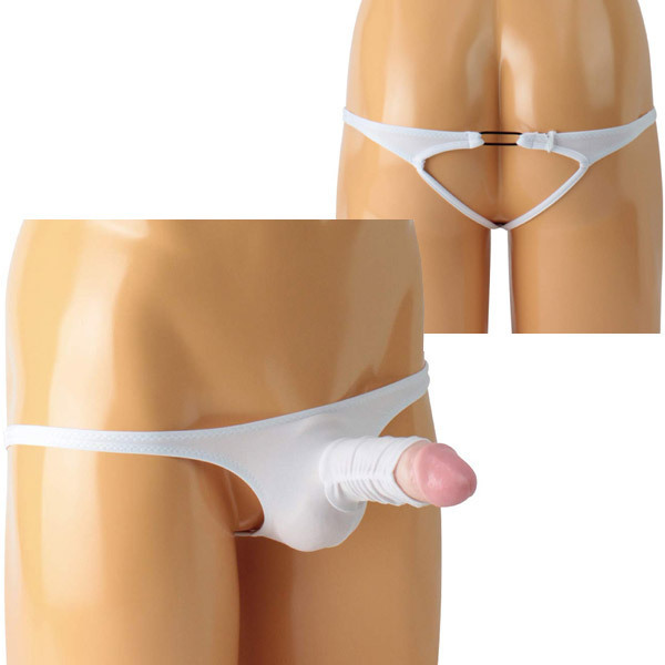 亀頭をチラリと覗かせるエロティックデザインの日本製Vバック(メンズ用)。 上下左右に伸縮性のあるストレッチ生地を採用した穿き心地の良い男性用ショーツ!ホワイトカラー、Mサイズ |