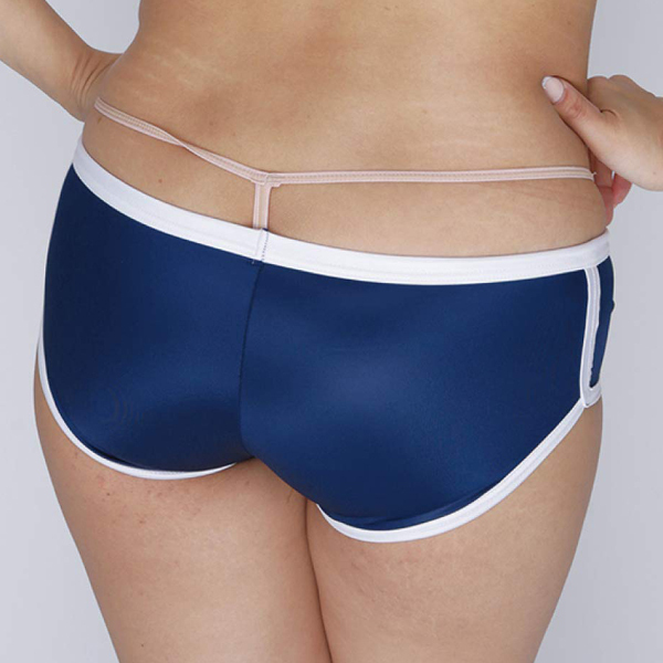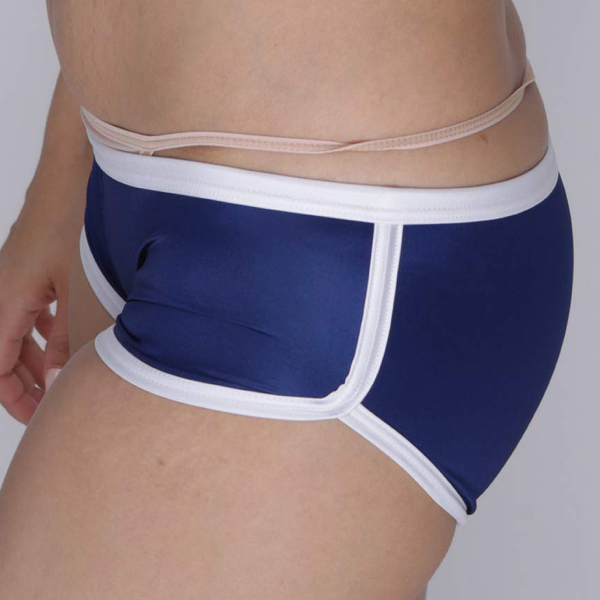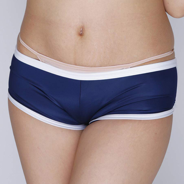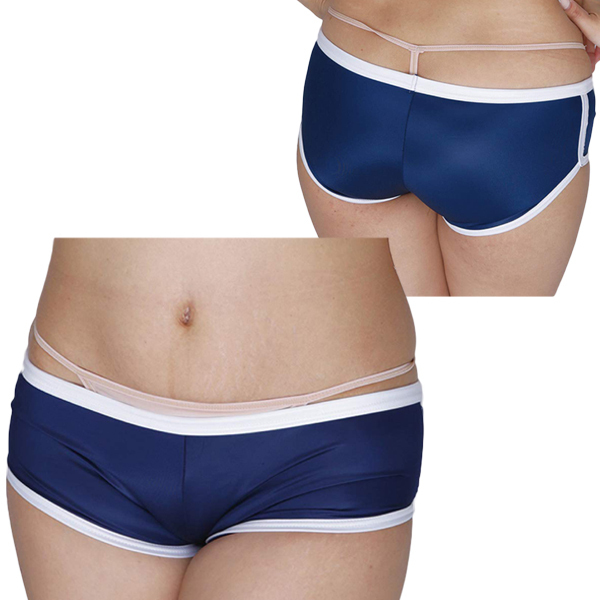 柔らかな光沢と伸縮性が特徴的なストレッチ生地を採用!穿き心地抜群なブルマ風ホットパンツ(ネイビー)。 制服衣装や別売りの「光沢ストレッチ体操服 下乳Tシャツ ネイビー」などの体操着コスプレと組み合わせて着ても可愛い! |