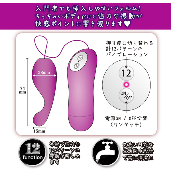Gスポ刺激で連続快感!中イキ好きにはたまらないシリコンローター。 ポコッと飛び出た先端が絶妙な角度でGスポを狙い撃ち!コンパクトボディから繰り出される12パターンもの強力振動が最高の絶頂へと誘います。 初心者さんも簡単なシンプル操作!肌に優しい柔らかなシリコン素材を採用。 生活防水、電池式(単4電池×2) |