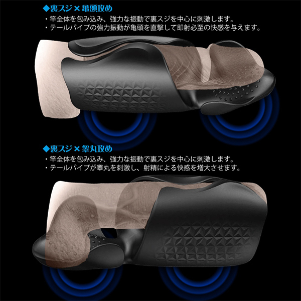 上下に内蔵された2つの振動モーターでサオ全体を包み込み強力振動!男を唸らせる究極の電動マッサージャー(USB充電式)。 10種類の豊富な振動パターンを搭載!覆う向きを変えれば「裏筋×亀頭」「裏筋×睾丸」といった好みの部分を重点的に刺激できる♪肌に優しいメディカルグレードシリコン素材を使用、お手入れしやすい生活防水!充電後60分の連続稼働が可能です。 |