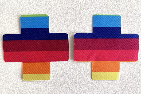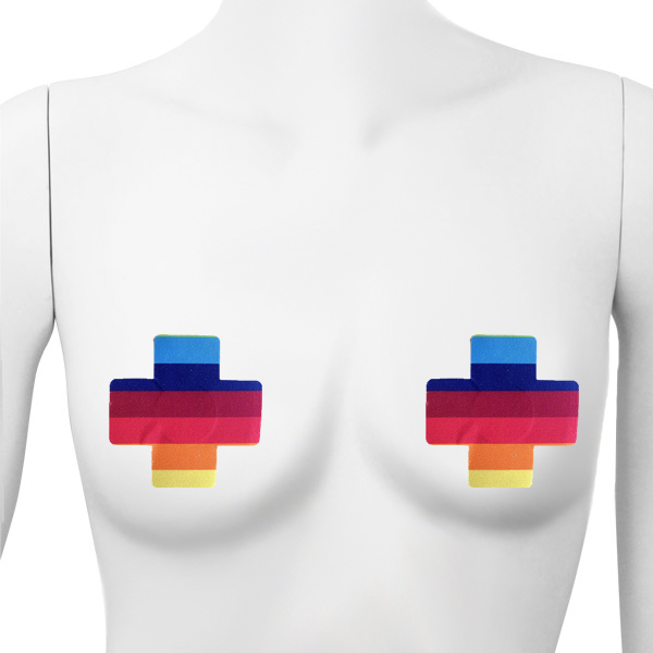 カラフルな虹が胸元を可愛く彩る十字型のニップルシール(レインボー)。 擦れ、透け防止ほかオシャレアイテムとして!先端に触れる部分には粘着しない素材を使用しているので肌に優しい♪2枚1セット |