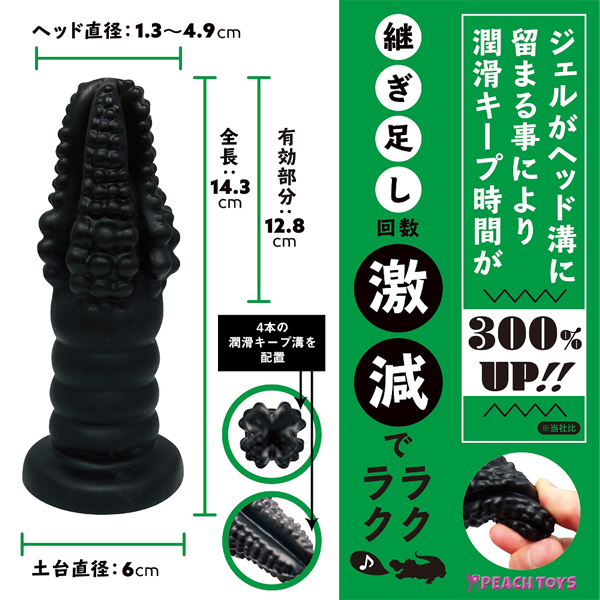 継ぎ足し回数が激減する!?スムーズにプレイが楽しめる144粒の突起が付いた日本製のアナル専用ディルド。 潤滑ローションが溜まる深めの溝を先端に4本配置したことで、乾きにくくした使い勝手の良いディルド!先端から下にいくにつれて大きさが増すワニ型ヘッドは、初心者〜上級者まで満足のいくサイズとなっております。 柔軟性と弾力性のある素材を使用 |