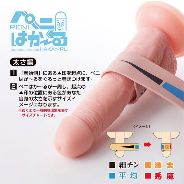 貴方のアソコは何センチ?巨根、ややデカなど目で見て分かりやすい男性自身のサイズ計測に特化したジョークグッズ。 長さ、太さ、気になる数値をお家で手軽に調べられる♪女性へのアプローチなどに◎ |