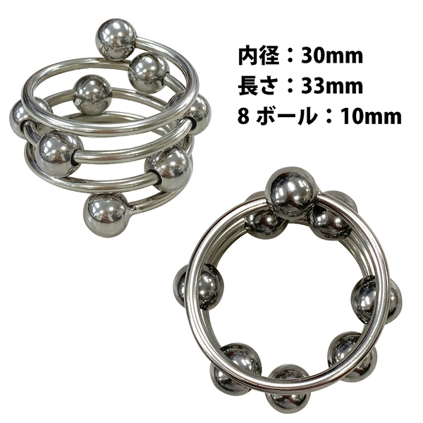 男性機能を高めながら格好良くお洒落に飾る内径3cmのメタル製男性補助リング。 可動式の8つの金属ボール付きで、複数使いでさらに刺激がパワーアップ!螺旋状にデザインされたスタイリッシュな見た目に気分も上がります♪長さ3.3cm、ボールサイズ1cm |