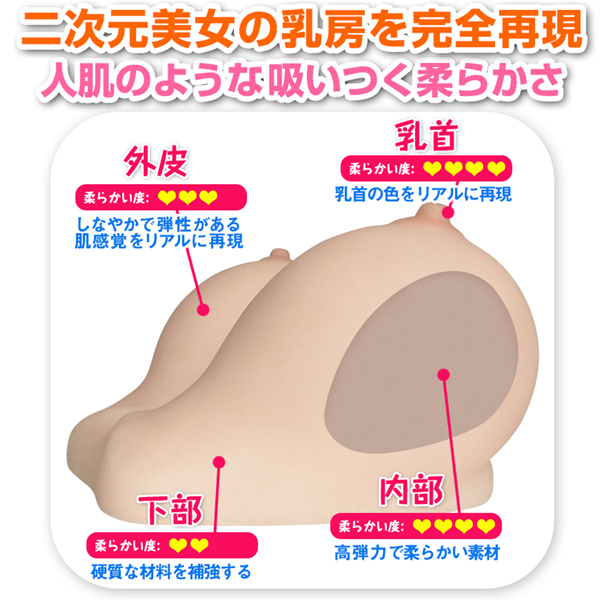 むっちりスベスベ極上の触り心地♪約1.75kgのGカップふわふわリアルおっぱい。 無臭でベタつき無く滑らかな質感の特殊素材仕様で仕立てた弾力とハリのある人肌感で美女の乳房をリアルに再現!部位によって異なる弾力が本物と錯覚させます♪コリコリ乳首としっとり吸い付く柔らかな豊満Gカップを揉みしだき、思う存分パイズリしちゃってください!ローション付 |