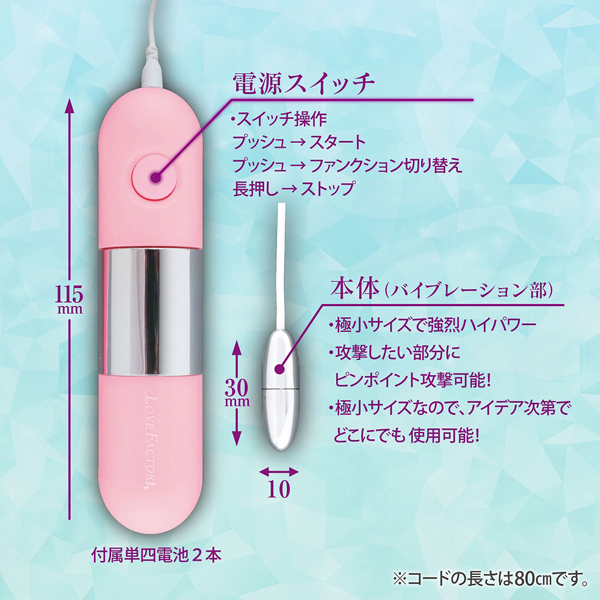 【単四電池×2本(付属)】長さ3cm、幅1cmの超ミニローター。 しかしながら驚きのハイパワーを搭載!極小サイズなので、当てたい場所にダイレクトに攻撃が可能。 付属の専用ベルトを使えば、手で持たないので、威力をなくすことなく、振動をダイレクトに感じられます。 指サックの中に入れて、電動フィンガーとしての使用も可能です。 |