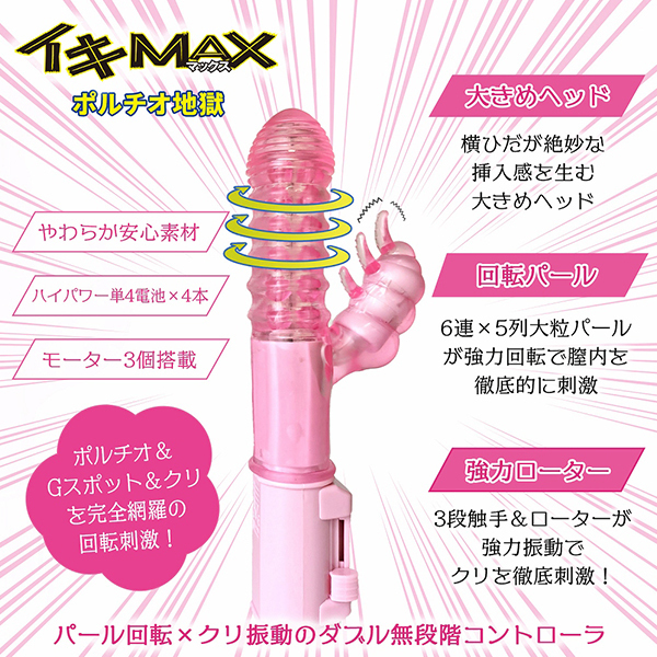 ポルチオ&Gスポット&クリトリスをマックス刺激!無間の快楽責めが続くポルチオ絶対主義バイブ!やわらかムチムチな安全エラストマー素材で初心者も安心・満足!大きめヘッドの8段もの横ヒダがもたらす絶妙な引っかかり挿入感!6連×5列の大粒パールが密着回転して、あそこを徹底的に刺激します。 3段触手のついたクリバイブは、強力振動でクリを蹂躙。 |