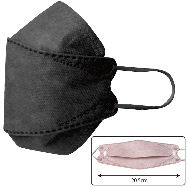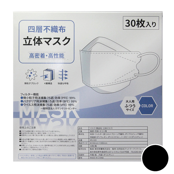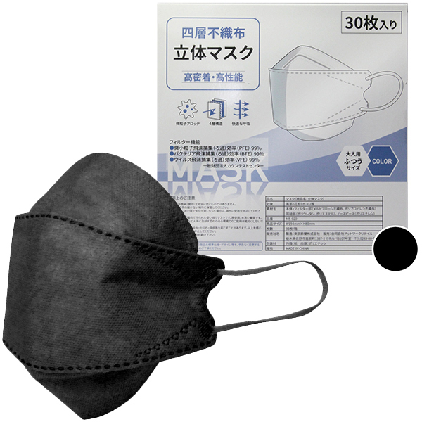 風邪・花粉・ウイルス対策に。 大人用で普通サイズの四層不織布立体マスク(ブラック)です!30枚入りの高性能四層不織布立体マスク。 フィルター機能は微小粒子飛沫捕集率(ろ過)効果(PFE)99%。 バクテリア飛沫捕集(ろ過)効果(BFE)99%。 ウイルス飛沫捕集(ろ過)効果(VFE)99%。 立体構造でマスク内部にスペースが出来るため快適にすごせます。 |