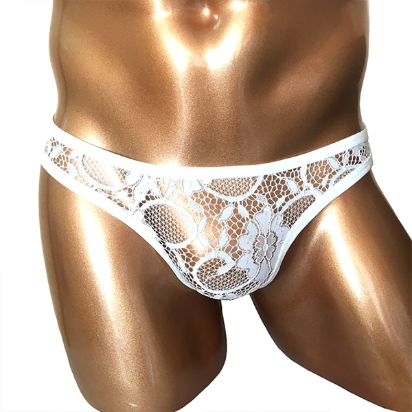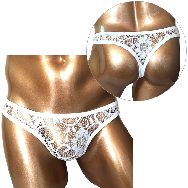 伸縮性があり涼しげな素材のレースビキニがバッドダディブランドから新登場!前後左右、全部シースルーでスケスケ♪ブラジリアンスタイルのお尻にくい込む、白い花柄レースがキュートな男性用のレースビキニです。 |