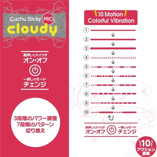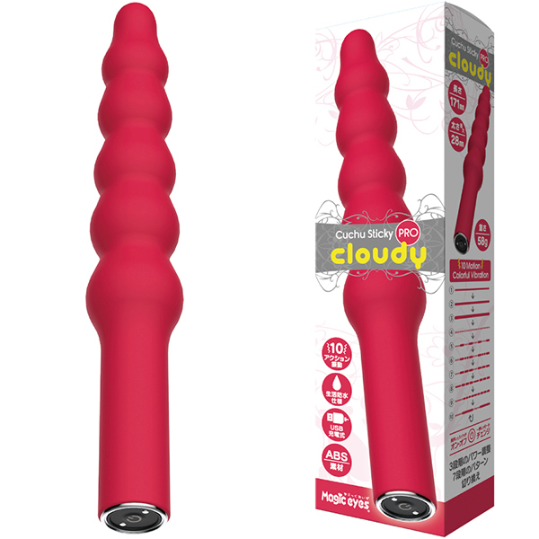 電源はUSB充電式で、ポコポコとした雲のような形状だから入り口から奥までの刺激をしっかりと楽しめるスティックローターです。 10モードもの振動パターンがあるので、その中から自分の好みを選ぶことが出来、生活防水設計となっているのでメンテナンス製にも優れています♪マグネット式の充電用USBケーブルが付属しているのでご家庭の環境で充電可能!操作方法も簡単で電源スイッチの長押しでオン・オフのみというシンプルさ♪クリムゾンマットコーティングのボディは長さ171mmと十分なサイズ、太さは最大28mmで細い部分から徐々に太くなるのでどなたにでも使用して頂けます。 |