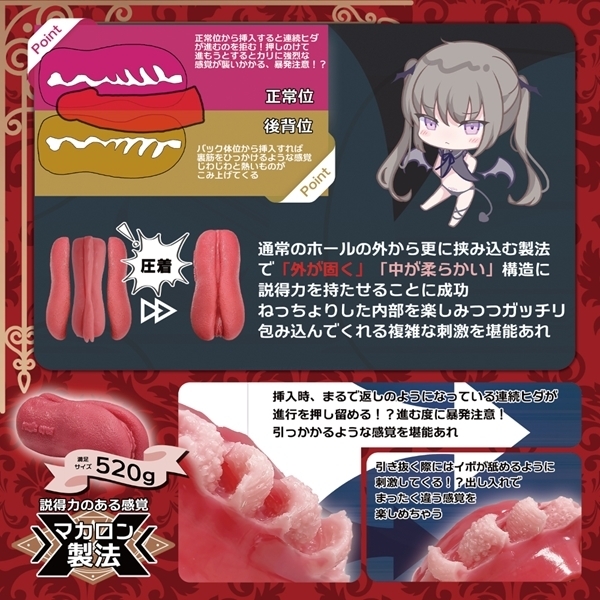 柔らかいオナホを外側から硬めの素材で圧着した非貫通オナホ「ハードカバーなトロトロ生膣マカロン」。 内側と外側が別々のパーツで成形された「マカロン製法」だからこそ実現した使用感が新鮮です!中はフワフワだけど外はしっかりとしたハードカバータイプ。 内部には粘膜層もあり3種の素材で構成されています♪大きな三連返しヒダと細かなイボは上下を逆転させる事で全く異なる使用感!520gの大型ボディの素材には厚生労働省、食品衛生法第370号に準拠した「Magiceyes Skin」を採用しているので安心してご使用頂けます。 ローション付属 |