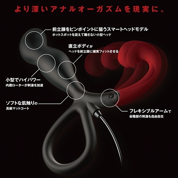 お手軽さが定評の前立腺開発グッズ「エネマブルR」に上級者タイプが登場しました!3段階に可動するアームで会陰部の刺激も自由自在♪12段階の強弱と10種類の振動パターンによる120種類の振動が前立腺を抉り出す!前立腺を刺激するために開発された洗練されたフォルムが悶絶のドライオーガズムへと導く♪3段階に可動するフックで会陰部への刺激も自由自在にお楽しみ頂けます! |