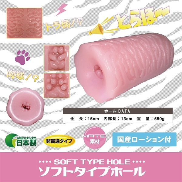 みんなも一緒にとらほ〜しよう♪ソフトタイプホール。 ●上下からのイボ刺激●3方向から包み込むコブヒダ●ウラスジはv字型突起が刺激●先端は不規則な突起で刺激。 ローション付、日本製 |