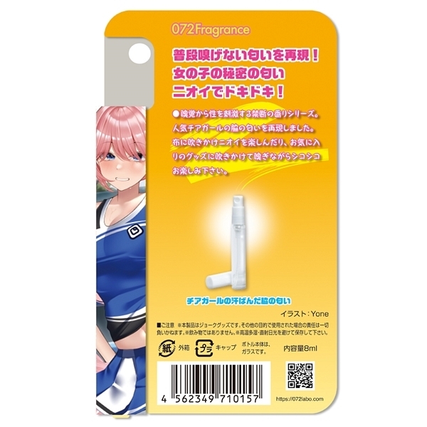 嗅覚から性を刺激する禁断の香りシリーズから「人気チアガールの汗ばんだ脇の匂い」がするエッチなニオイのフレグランスが登場しました♪人気チアガールのワキの匂いを再現!布に吹きかけて脇の匂いを楽しんだり、お気に入りのグッズに吹きかけて嗅ぎながらシコシコお楽しみ下さい。 |