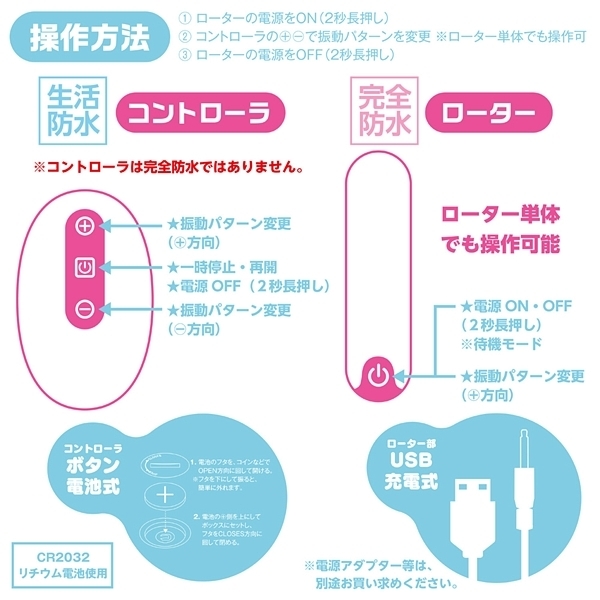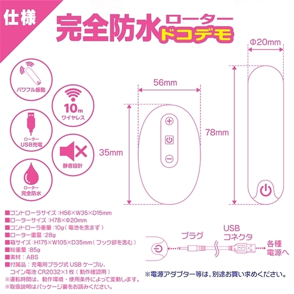 | ■仕様:パッケージ:17.5×10.5×3.5cm 本体:ローター7.8×2.0cm・コントローラー5.6×3.5×1.5cm 電池:本体(USB充電式)、リモコン(ボタン電池CR2032) |