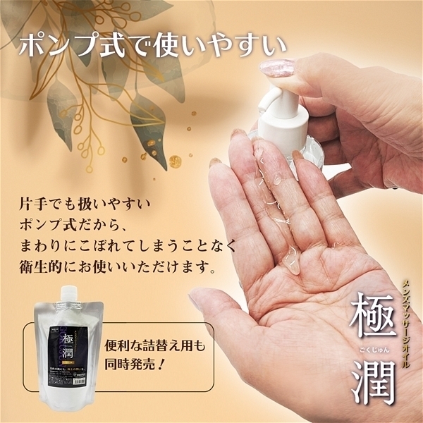 「最上級の潤い」、「最上級の滑らかさ」、さらに「最上級の使いやすさ」を追い求めて完成したマッサーオイル「極潤」。 保湿に優れたグリセリンに加えヒアルロン酸Naを贅沢に配合することで使用後はもっちりぷにぷにしたお肌に仕上がります。 熱伝導に優れた温感タイプなので塗った瞬間からじんわり温かく感じます。 ※成分上、舐めると甘く感じますが飲み物ではございません、飲み込まないようにご注意ください。 大変滑りやすいので足元にこぼさぬようご注意ください。 ボトルタイプ |