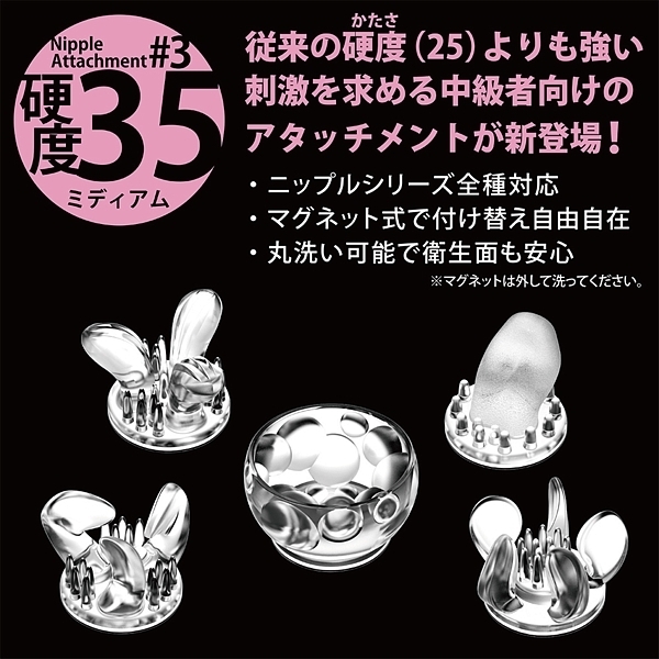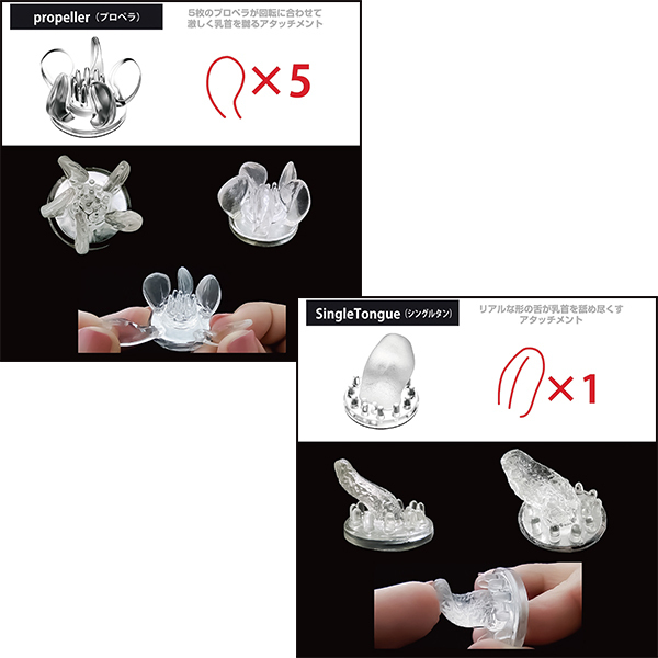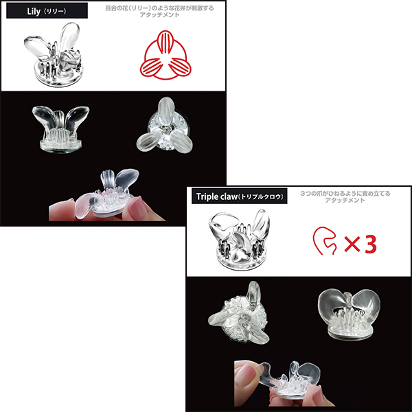 個性あふれる5種のアタッチメントを、両乳首に使えるよう、すべて2個ずつご用意。 セットで使うもよし、あえて別々にして2人から乳首責めを疑似体験するのも一興です。 ●Lily(リリー)リリーの花をイメージした、外側にひらく花びら型のアタッチメント。 ●Triple Claw(トリプルクロー)内側に向かった3つのツメが特徴的なアタッチメント。 ●Propeller(プロペラ)5枚のプロペラが次々と乳首を刺激するアタッチメント。 ●Single Tongue(シングルタン) 小さな舌が回転しながら舐め尽くすアタッチメント。 ●Ball Cup(ボールカップ)カップの中に大小さまざまのボールが不規則配置されたアタッチメント。 ●素材:エラストマー ※直にお肌と接触する場合は、必ずローション(水溶性)をご利用ください。 ※こちらの商品はニップルドーム・カップシリーズの交換用アタッチメントです、商品単体ではご使用いただけませんのでご注意ください。 |