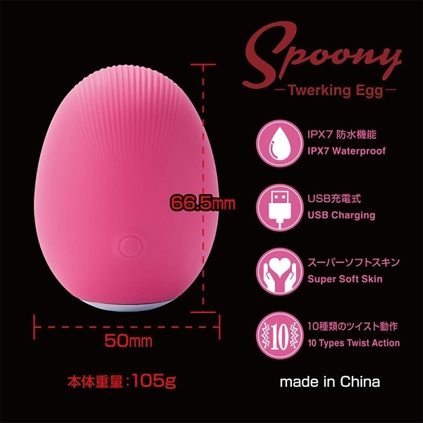 このスプーニー トワーキングエッグはとても柔らかな肌触り。 まるでマシュマロの様な滑らかさが自慢です。 また振動は珍しい左右ツイスト振動。 優しく、心地よいツイスト振動があなたを揺らします。 操作は簡単。 まず電源スイッチを長押しで起動。 起動後は短押しで10種類の振動パターンを楽しむことが可能です。 およそ55分の充電で最大25分の使用が可能です。 女性への優しさが詰まったスプーニー トワーキングエッグ。 ゆらゆらと揺れる様な振動をお楽しみください。 ●カラー:ピンク |