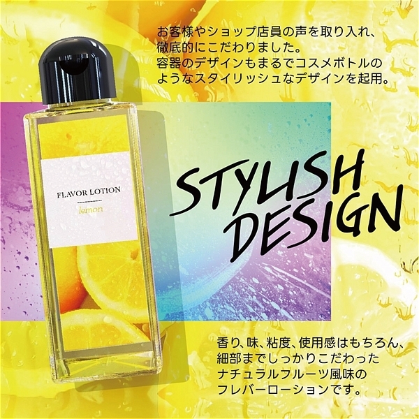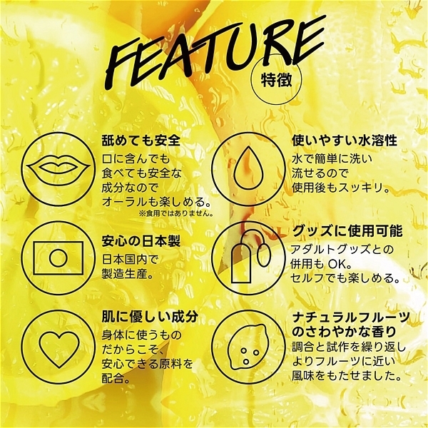 レモン。 フルーティーな味と香りで新感覚プレイ!ワイルドワン女子が企画・開発した女性のためのフレバーローション!安心安全の国内素材で水のように「超さらさら」、フルーツみたいに美味しい水溶性ローションです!<成分>精製水、PG、ポリクオタニウム-39、グリセリン、サッカリンNa、ヒアルロン酸Na、ハチミツ、アロエベラ葉エキス、香料、黄色4号、BG、エタノール、メチルパラベン、エチルパラベン、プロピルパラベン、ブチルカルバミン酸ヨウ化プロビニル。 ※「本製品はバイブバー公式認定ローション 味・香り付き」の後継として開発されましたが味と香り付きという点以外は、成分もテクスチャもまったく異なる新製品です。 |