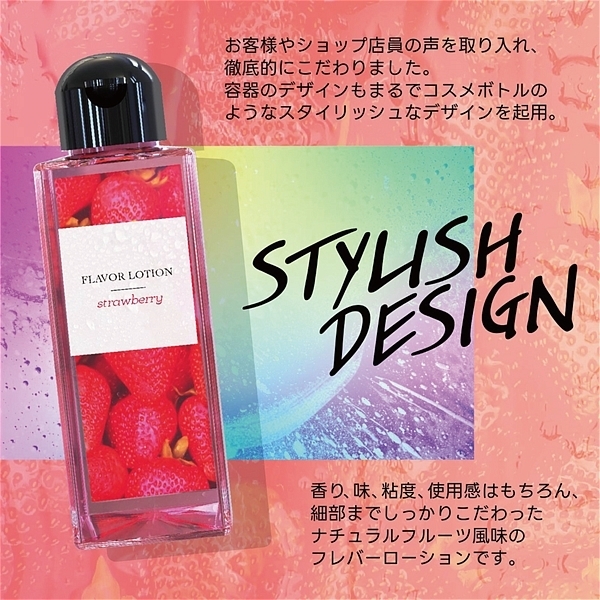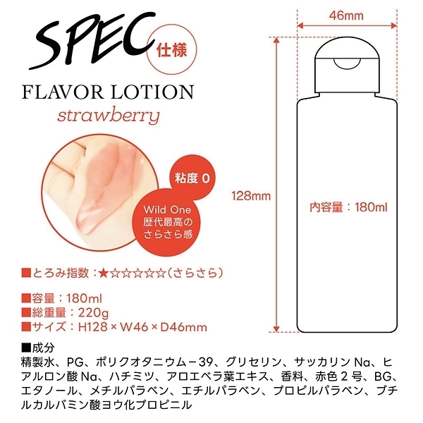 ストロベリー。 フルーティーな味と香りで新感覚プレイ!ワイルドワン女子が企画・開発した女性のためのフレバーローション!安心安全の国内素材で水のように「超さらさら」、フルーツみたいに美味しい水溶性ローションです!<成分>精製水、PG、ポリクオタニウム-39、グリセリン、サッカリンNa、ヒアルロン酸Na、ハチミツ、アロエベラ葉エキス、香料、赤色2号、BG、エタノール、メチルパラベン、エチルパラベン、プロピルパラベン、ブチルカルバミン酸ヨウ化プロビニル。 ※「本製品はバイブバー公式認定ローション 味・香り付き」の後継として開発されましたが味と香り付きという点以外は、成分もテクスチャもまったく異なる新製品です。 |