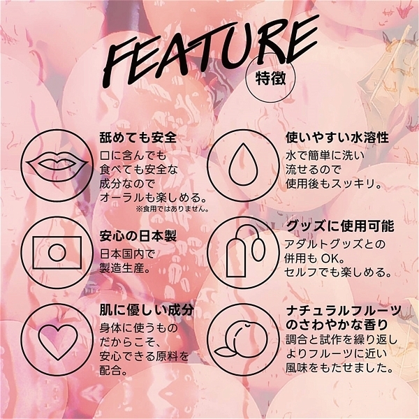 ピーチ。 フルーティーな味と香りで新感覚プレイ!ワイルドワン女子が企画・開発した女性のためのフレバーローション!安心安全の国内素材で水のように「超さらさら」、フルーツみたいに美味しい水溶性ローションです!<成分>精製水、PG、ポリクオタニウム-39、グリセリン、サッカリンNa、ヒアルロン酸Na、ハチミツ、アロエベラ葉エキス、香料、赤色106号、BG、エタノール、メチルパラベン、エチルパラベン、プロピルパラベン、プチルカルバミン酸ヨウ化プロビニル。 ※「本製品はバイブバー公式認定ローション 味・香り付き」の後継として開発されましたが味と香り付きという点以外は、成分もテクスチャもまったく異なる新製品です。 |