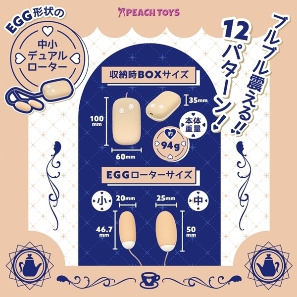 | ■仕様:パッケージ:16.0×7.0×5.0cm 本体:収納時BOX10.0×6.0×3.5cm・EGGローター(小)4.6×2.0cm・EGGローター(中)5.0×2.5cm・コード長約70.0cm USB充電式 |