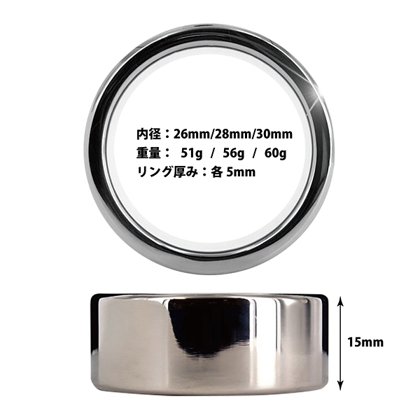男の機能をアップさせスタイリッシュに拘束感を味わえるメタルコックリングシリーズ滑らかな形状で美しい鏡面加工とメタルならではの硬度と加重で貴方の怒張をよりクールに!内径の異なる3サイズ展開で発売中!●内径30mm |
