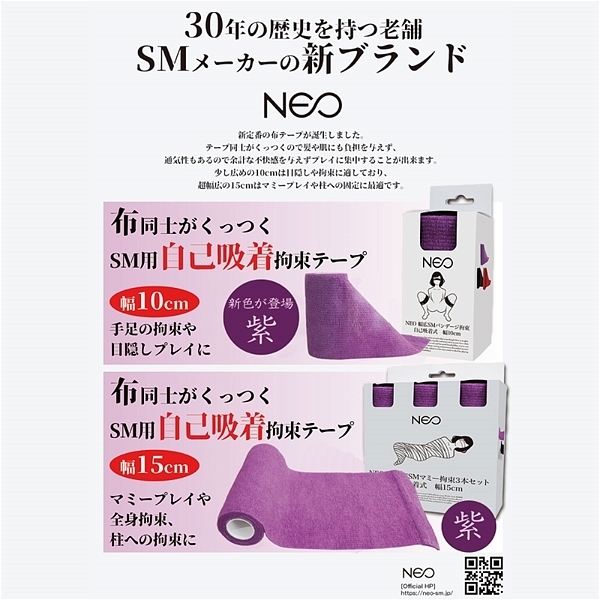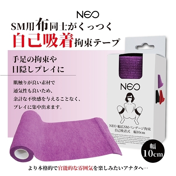 糊が無いのに布同士がくっつくSM拘束テープ、新色の紫色です。 非粘着なので扱いやすく、目隠しの際に髪に引っ付く事はありません。 肌触りが良い素材で通気性も良いため、相手に余計な不快感を与えることなく、プレイに集中することが出来ます。 通常よりも広い10cm幅は手足の拘束や目隠しプレイに最適です。 |